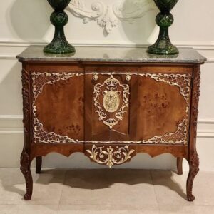 آینه و کنسول چوبی طلایی ساده و شیک از چوب راش ساخته شده است و بدنه آن با هنر زیبای منبت، کنده کاری شده است. دور بدنه این کنسول با حصیر طبیعی بامبو کار شده است و بر روی صفحه کنسول از سنگ طبیعی استفاده شده است. این کار یک کشو قابل استفاده نیز دارد.