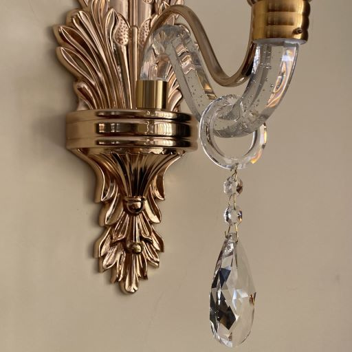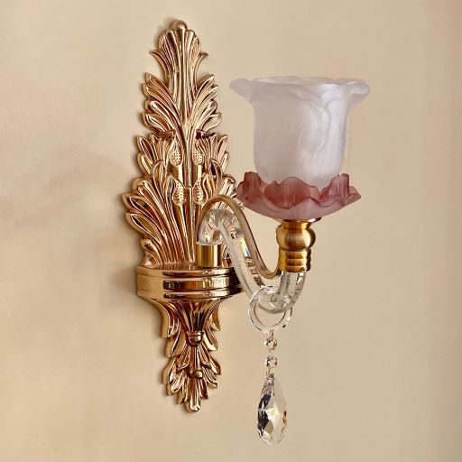 بدنه لوستر دیواری پذیرایی صورتی از فلز آبکاری شده ساخته شده است. کاسه و گل این لوستر از جنس کریستال میباشد. علاوه بر لوستر، شاخه آن نیز روشن میشود که میتواند نور بسیار خوبی برای شما فراهم نماید. این لوستر دیواری از سری کارها وارداتی موجود در ترنم گالری میباشد.