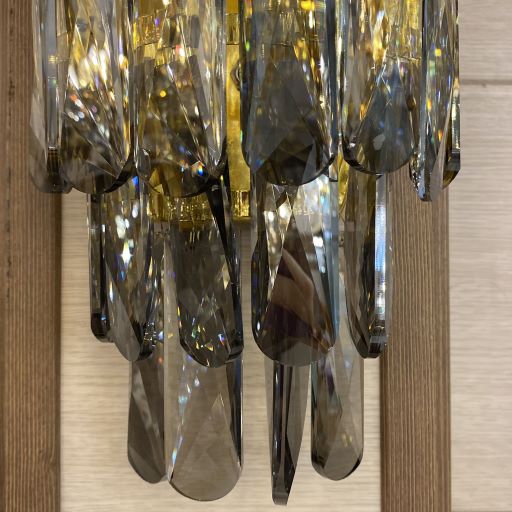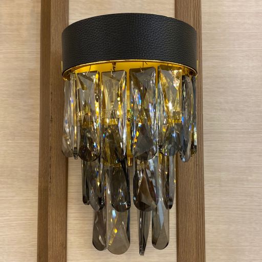 بدنه لوستر دیواری مدرن شیک چرم از فلز آبکاری شده ساخته شده است و آویزهای آن از جنس کریستال میباشند. این کالا دارای دو شعله نوری است. در قسمت بالای بدنه لوستر دیواری با چرم کار شده است. این محصول از سری لوسترهای وارداتی موجود در ترنم گالری میباشد.