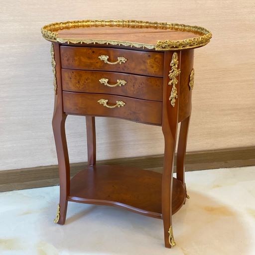 بدنه میز تلفن چوبی سه کشو از چوب راش ساخته شده است و بر روی آن برنز قرار گرفته است. این میز دارای سه کشو قابل استفاده میباشد.