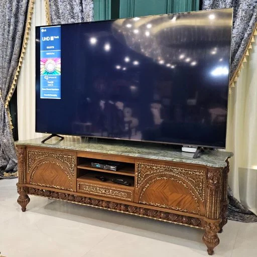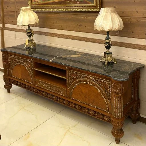 این محصول تنها وسیلهای جهت قرار دادن تلویزیون محصول نمیشود بلکه اثری هنری است که از ترکیب چوب و برنز و سنگ ساخته شده است و هنر منبت به آن شکوه بخشیده است. میز تلویزیون کلاسیک برنزکوب وسیلهای باشکوه جهت افزایش زیبایی و جلوه در دکوراسیون داخلی محسوب میشود که روحی تازه به فضای داخلی شما میبخشد.