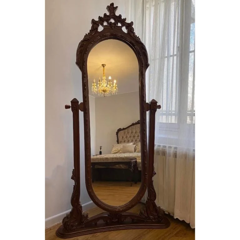 آینه قدی قهوه ای چوبی منبت ساخته شده از چوب راش. تمام بدنه این آینه قدی منبت کاری شده است و طرحها به زیبایی بر بدنه آن جلوهگر هستند. این آینه بر روی یک پایه ثابت شده است.