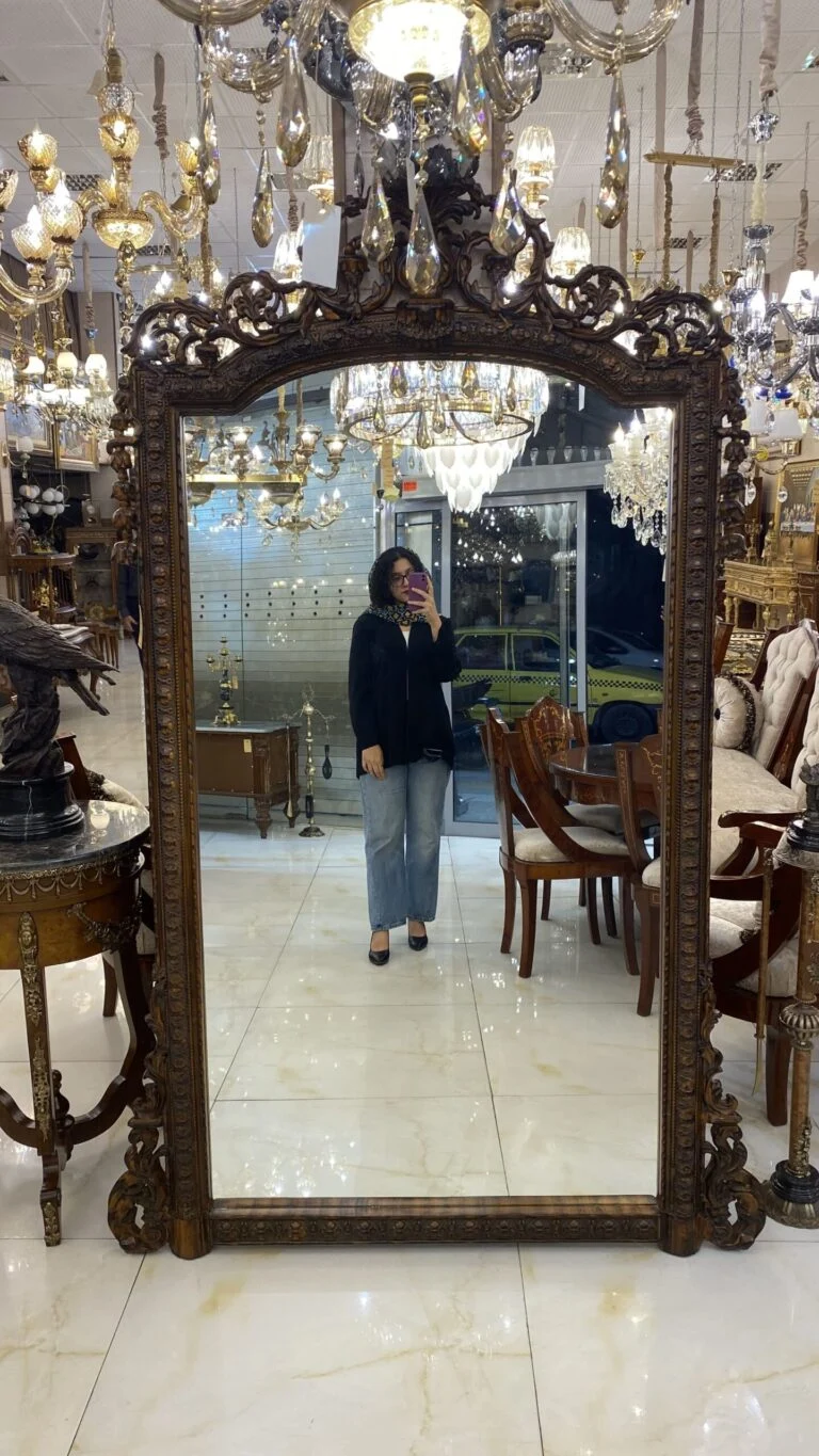 آینه قدی قهوه ای کلاسیک منبت. بدنه این آینه قدی از چوب راش ساخته شده است و تمام بدنه آن منبت کاری شده است. این آینه یکی از زیباترین و فاخرترین آینههای موجود در ترنم گالری میباشد که زیبایی و شکوه بسیاری دارد.