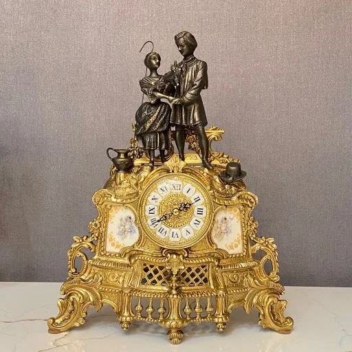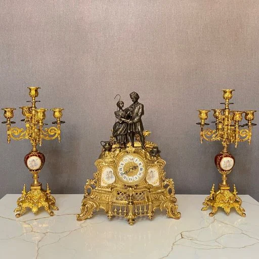 ساعت و شمعدان طلایی و قرمز طرح زن و شوهر مجموعهای از ساعت و دو عدد شمعدان است که بدنه آن از برنز ساخته شده است. ساعت و شمعدان برنز به عنوان اکسسوری قابل استفاده در دکوراسیون میباشد. ساعت و شمعدان کاربرد دکوری دارد و از آن میتوان برای دکور کردن کنسول، میز یا شومینه استفاده کرد.