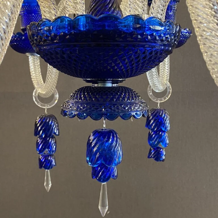 لوسترپذیرایی باکارات شش شاخه، انتخابی زیبا برای افرادی است که در پی لوستری متفاوت و خوش رنگ هستند. رنگ آبی و ترکیب آن با سفید، علی الخصوص برای لوستر جسارتی بسیار در انتخاب به همراه دارد. آویزها و کاسه‌های لوستر آبی و سفید از کریستال تراش خورده ساخته شده‌اند.