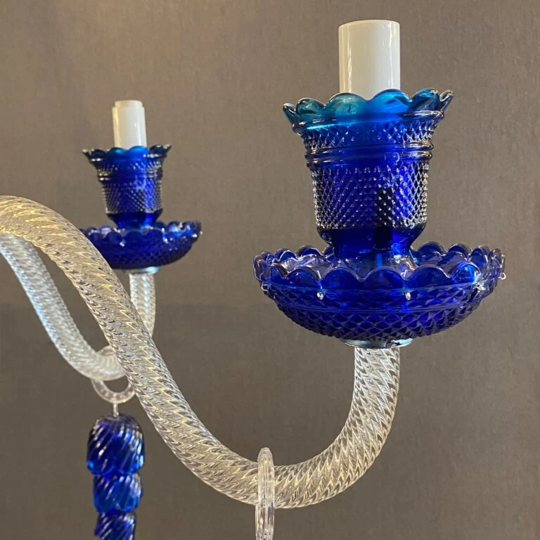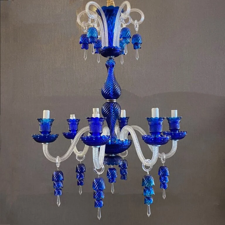 لوستر آبی و سفید باکارات شش شاخه، انتخابی زیبا برای افرادی است که در پی لوستری متفاوت و خوش رنگ هستند. رنگ آبی و ترکیب آن با سفید، علی الخصوص برای لوستر جسارتی بسیار در انتخاب به همراه دارد. آویزها و کاسه‌های لوستر آبی و سفید از کریستال تراش خورده ساخته شده‌اند.