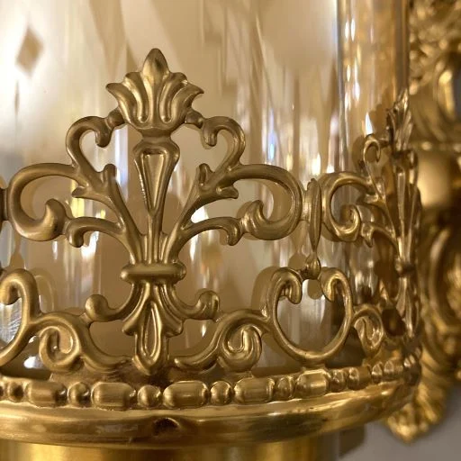 بدنه چراغ دیواری لوکس دو شاخه طلایی از فلز آبکاری شده ساخته شده است و استوانه داخلی در فضای شیشهای قرار گرفته است که علاوه بر جنبه زیبایی به محافظت کالا نیز کمک شایانی مینماید. این لوستر دیواری از سری لوسترهای وارداتی میباشد.
