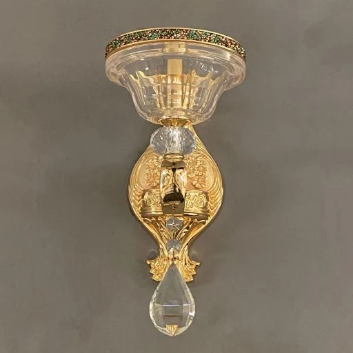 بدنه لوستر دیواری طلایی شیک تک شاخه از فلز آبکاری شده ساخته شده است و کاسه آن از کریستال می‌باشد. بر دور بدنه کاسه لوستر با نگین زینت داده شده است. این محصول از سری کالاهای وارداتی موجود در ترنم گالری می‌باشد.