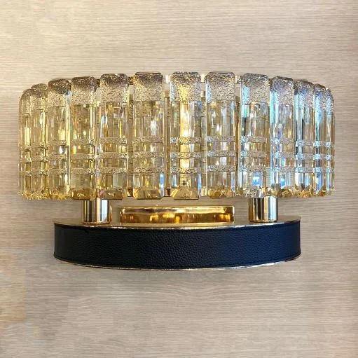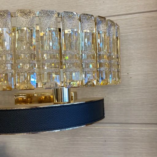لوستر دیواری نئوکلاسیک طلایی و چرمی. بدنه این لوستر دیواری از فلز آبکاری شده ساخته شده است و آویزها از جنس کریستال میباشند همچنین دور بدنه آن نوار چرم کشیده شده است. این لوستر دیواری دارای دو شعله میباشد.