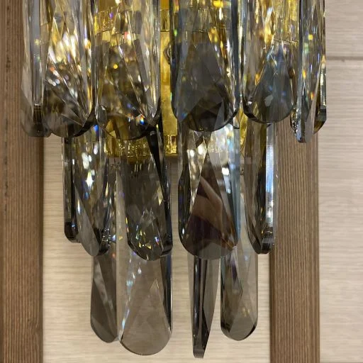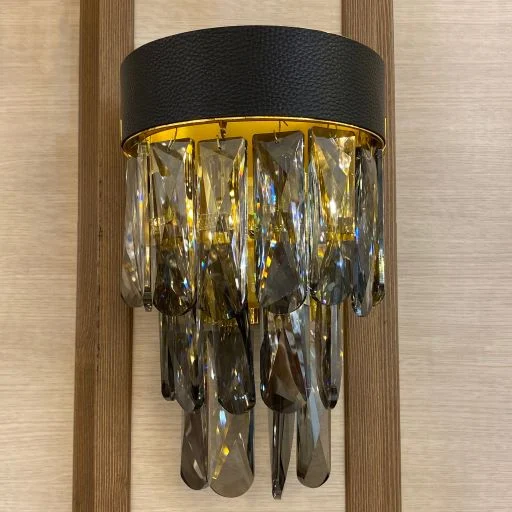 بدنه لوستر دیواری مدرن شیک چرم از فلز آبکاری شده ساخته شده است و آویزهای آن از جنس کریستال می‌باشند. این کالا دارای دو شعله نوری است. در قسمت بالای بدنه لوستر دیواری با چرم کار شده است. این محصول از سری لوسترهای وارداتی موجود در ترنم گالری می‌باشد.