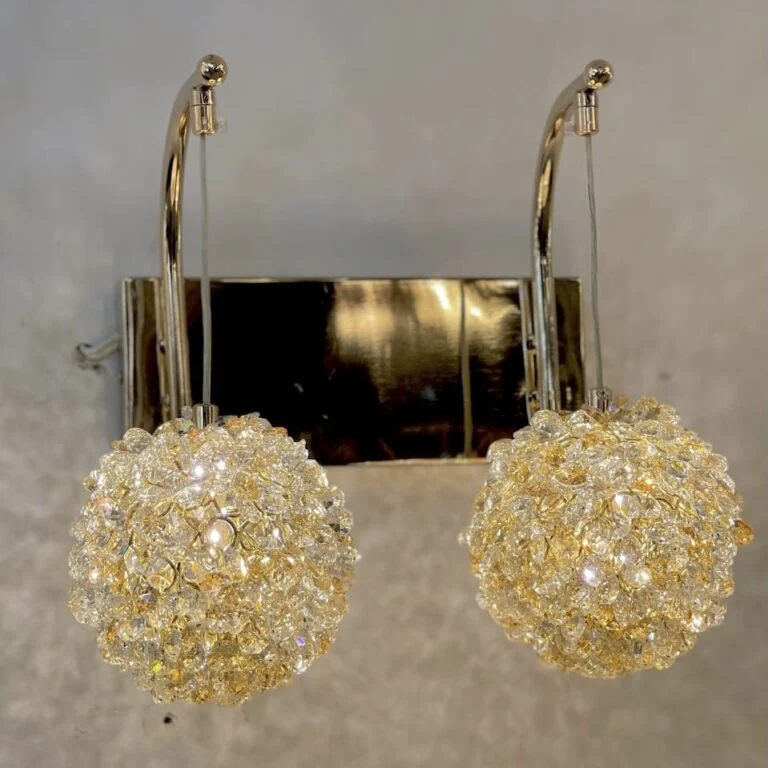 لوستر دیواری گرد دو شاخه آویز. بدنه لوستر دیواری از فلز آبکاری شده ساخته شده است و آویزها از جنس کریستال می‌باشند. این لوستر دیواری از سری لوسترهای وارداتی می‌باشد.