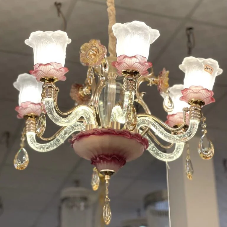 لوستر صورتی گل دار با دسته روشن. این لوستر شش شعله می‌باشد. این لوستر ساخته شده از کریستال تراش خورده و فلز آبکاری شده است. علاوه بر کاسه لوستر، دسته و بدنه این لوستر نیز روشن می‌شود.