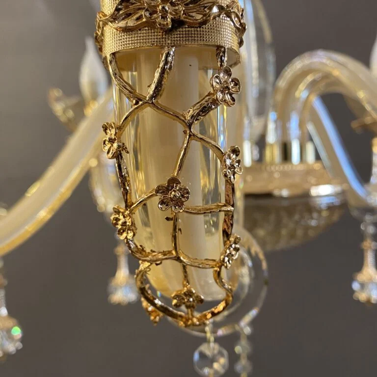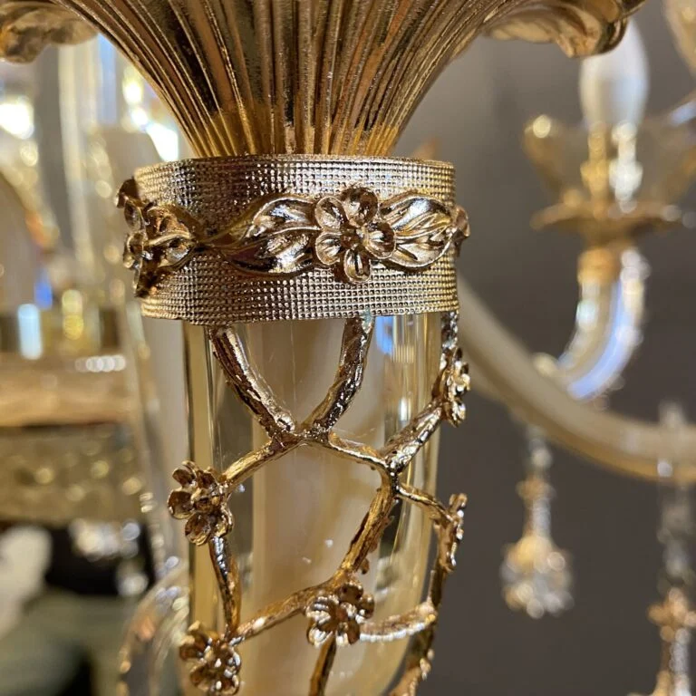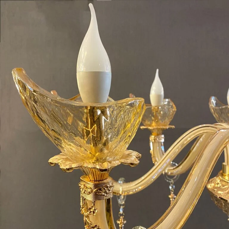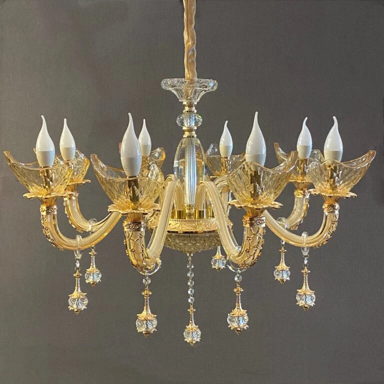 بدنه لوستر کلاسیک طلایی هشت شاخه لاله از فلز آبکاری شده ساخته شده است و کاسهها و آویزها از جنس کریستال هستند. این لوستر کلاسیک از سری لوسترهای لوکس وارداتی است.