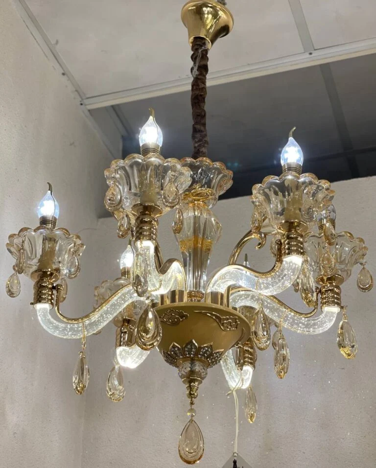 لوستر کلاسیک کرم و سفید شش شاخه. این لوستر ساخته شده از کریستال تراش خورده و فلز آبکاری شده است. علاوه بر کاسه لوستر، دسته و بدنه این لوستر نیز روشن میشود. این لوستر از سری لوسترها وارداتی موجود در گالری میباشد.