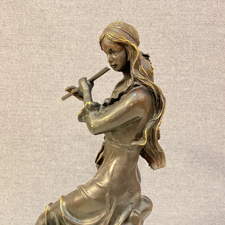 مجسمه زن فلوتیست برنز نشسته روی سنگ. مجسمه زن از برنز ساخته شده است و پایه آن سنگ میباشد که دارای کیفیت و اصالت میباشد. هنرمند خالق این اثر با الهام از مجسمههای کلاسیک زن و نقاشیهای کشیده شده از بانوان در قرون گذشته ساخته شده است. هنرمند خالق مجسمه زن در تلاش بوده است که حالت و احساسات زنان در دوران کلاسیک را در قالب مجسمه به نمایش بگذارد.