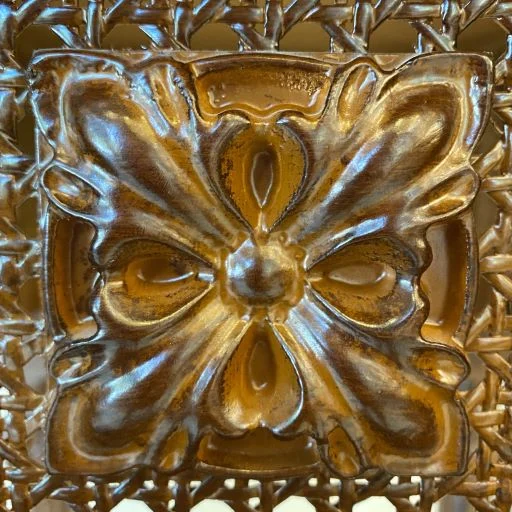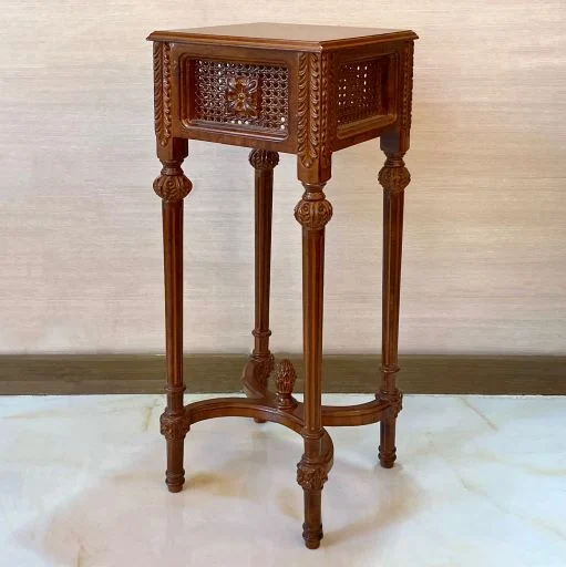 بدنه میز تلفن قهوه ای چوبی مربع از چوب راش ساخته شده است بر روی آن با هنر زیبای منبت کار شده است. همچنین دور کار با حصیر طبیعی تزیین شده و  است که بر زیبایی و اصالت کار بسیار افزوده.
