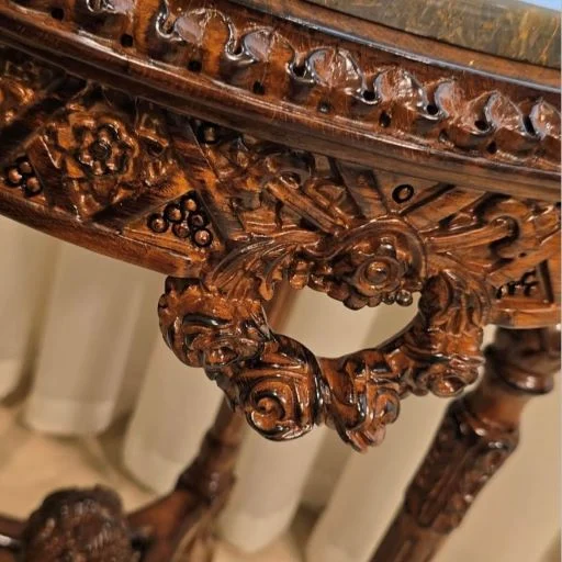 این میز از چوب راش ساخته شده است و منبت کاری شده. صفحه کار سنگ طبیعی می‌باشد. تنوع رنگ‌بندی در کار موجود است.