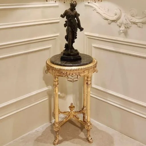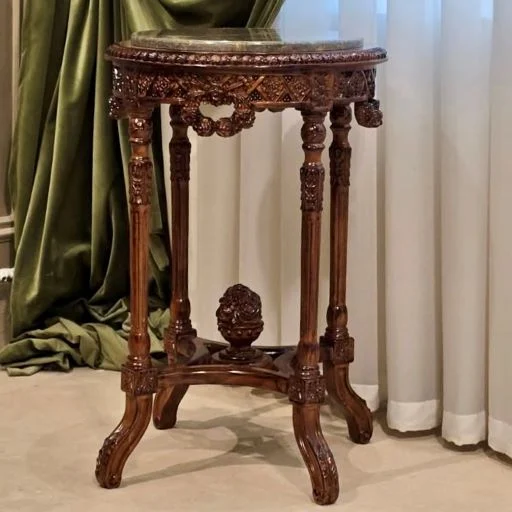 بدنه میز تلفن گرد قهوه ای شیک از چوب راش ساخته شده است و بر روی بدنه آن منبت کاری شده است. همچنین بر روی صفحه میز با سنگ طبیعی قرار گرفته است.