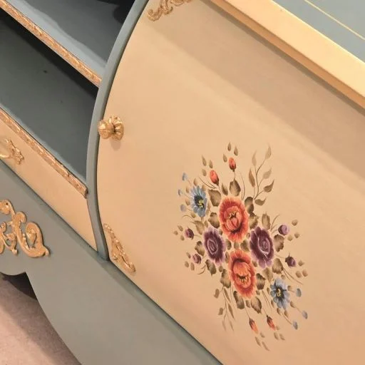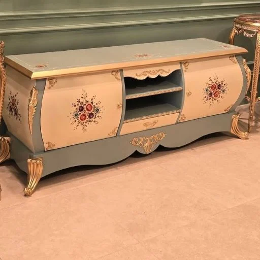 بدنه میز تلویزیون آبی و کرم جدید از چوب راش ساخته و بر روی بدنه آن با هنر برنز و نقاشی دست کار شده که بر ارزش محصول افزوده است. این میز دارای دو کمد، دو طبقه و یک کشو قابل استفاده میباشد.
