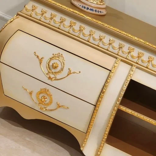 بدنه میز تلویزیون طلایی و کرم برنزکوب از چوب راش ساخته شده و بر روی بدنه آن با هنر زیبای برنز تزیین شده است. این میز دارای چهار کشو و دو طبقه قابل استفاده میباشد.