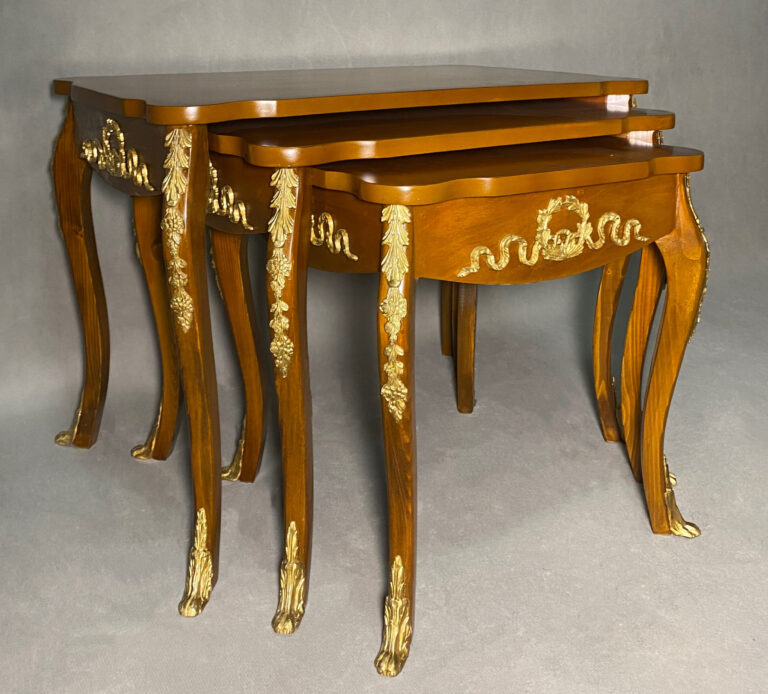 بدنه میز عسلی برنزکوب شیک سه تکه از چوب راش ساخته شده است و بر روی بدنه تمام سه تکه میزها با برنز تزیین شده است. این کار دارای سه عدد میز میباشد.