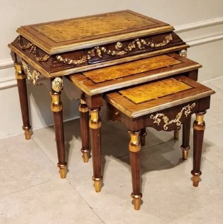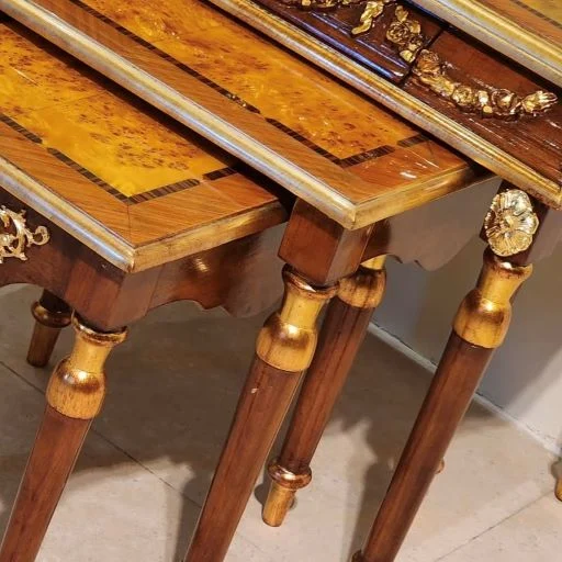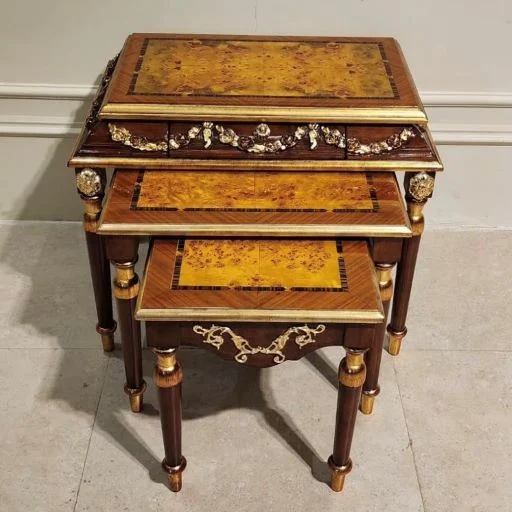 بدنه میز عسلی شیک کشودار از چوب راش ساخته شده است و بر روی بدنه آن با ترکیبی از هنر زیبای برنز و منبت تزیین شده است. این محصول دارای سه عدد میز می‌باشد که بزرگ‌ترین سایز آن دارای کشو نیز می‌باشد.