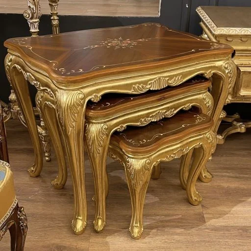 بدنه میز عسلی طلایی و قهوه ای شیک منبت از چوب راش ساخته شده است و بر روی بدنه آن با هنر زیبای منبت کنده کاری شده است. بر روی صفحات میز توسط هنرمند با دست نقاشی کشیده شده است.