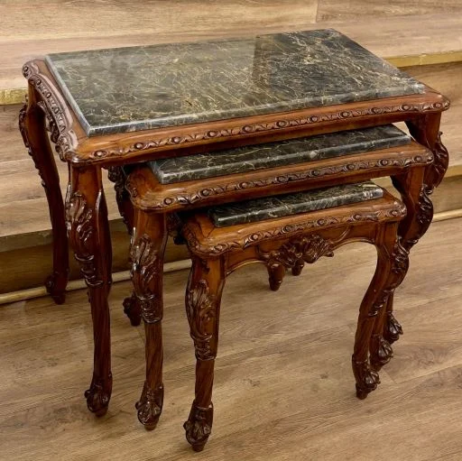 بدنه میز عسلی قهوه ای منبت شیک از چوب راش ساخته شده است و بر روی بدنه و پایه‌های میز منبت کاری شده است. صفحات این میز با سنگ طبیعی پوشیده شده است. این میز دارای سه تکه با خصوصیات ذکر شده می‌باشد.