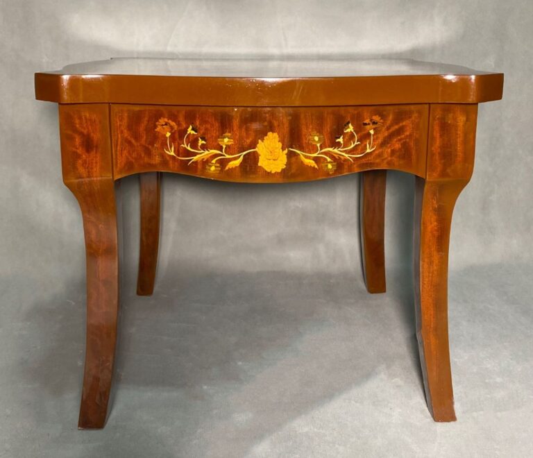 بدنه میز عسلی کنار مبلی قهوه ای معرق از چوب راش ساخته و بر روی صفحه آن با هنر زیبای معرق تزیین شده است.