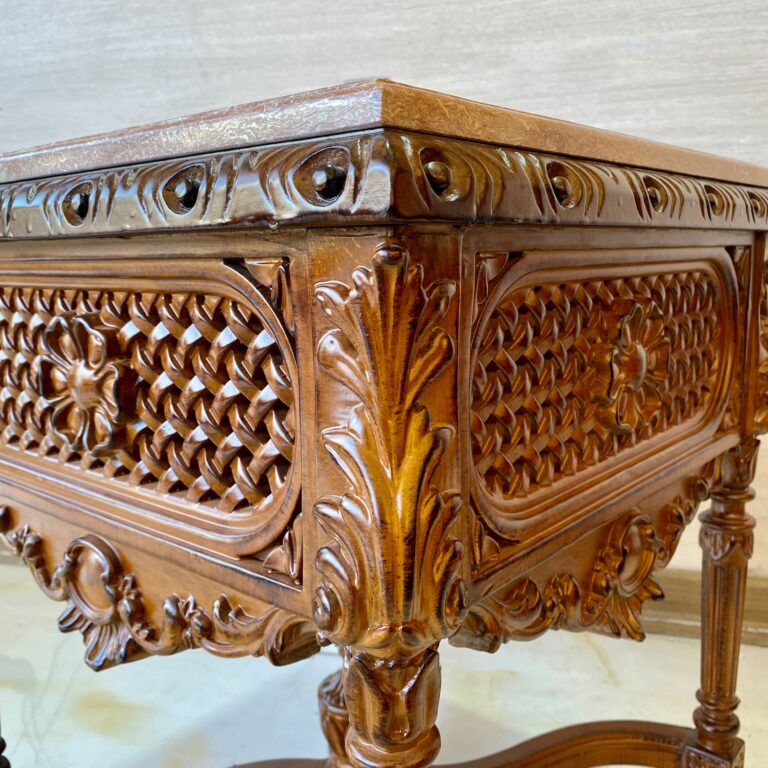 بدنه میز عسلی کنار مبلی قهوه ای و صورتی از چوب راش ساخته و بر روی بدنه آن با هنر زیبای منبت کار شده. بر روی صفحه این محصول با سنگ طبیعی کار شده است.