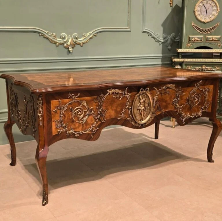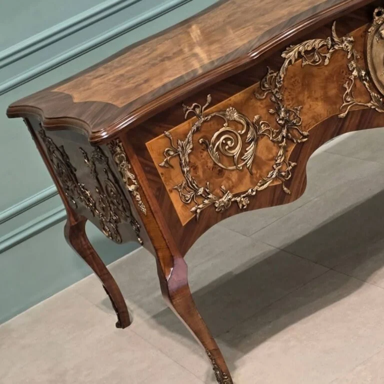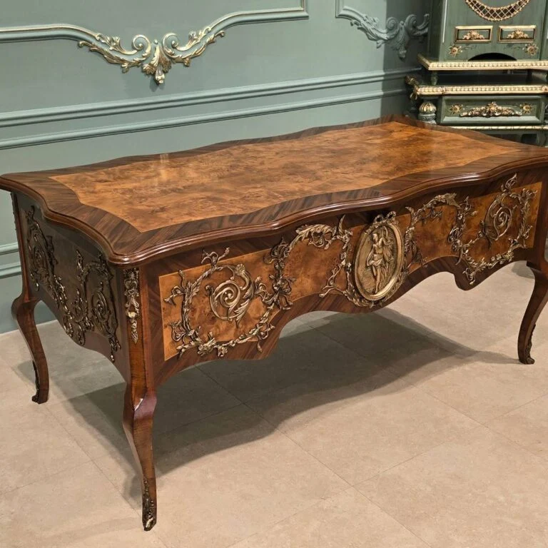 میز مدیریت قهوه ای کلاسیک برنز و معرق ساخته شده از چوب راش و برنز کوبی شده. بر روی بدنه این میز با هنر برنز تزیین شده است. طول این میز مدیریت ۱۸۰ سانتی متر میباشد که شما میتوانید در ابعاد بزرگتر و یا رنگ دیگری این میز مدیریت را سفارش دهید. جهت اطلاع بیشتر با پشتیبانی سایت در ارتباط باشید.