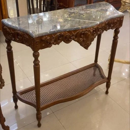 این کنسول چوبی از چوب راش ساخته شده است و منبت کاری شده است. بر روی صفحه این کنسول با سنگ طبیعی کار شده است که موجب افزایش زیبایی و اصالت کار شده. این کنسول در بسته‌بندی محکم و با اطمینان از بسته‌بندی اصولی برای شما ارسال خواهد شد.