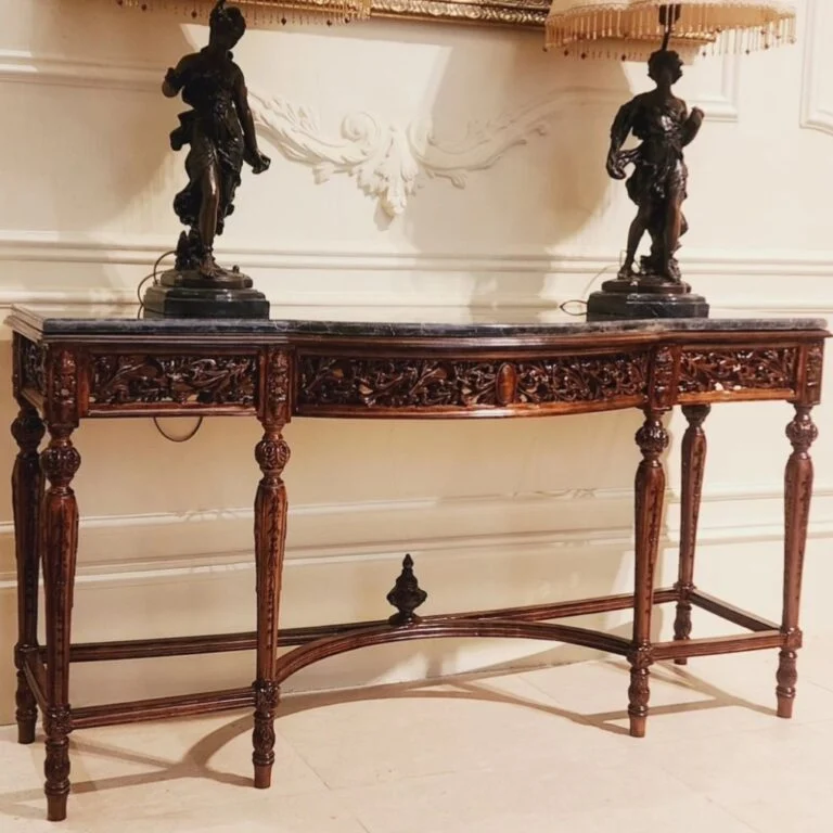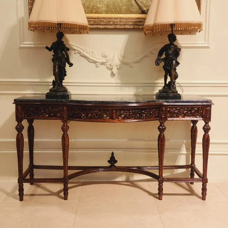 بدنه میز کنسول جدید قهوه ای چوبی منبت از چوب راش ساخته شده است و بدنه آن منبت کاری شده است. بر روی صفحه این کنسول چوبی زیبا با سنگ پوشیده شده است که بر ارزش و زیبای کار افزوده است.