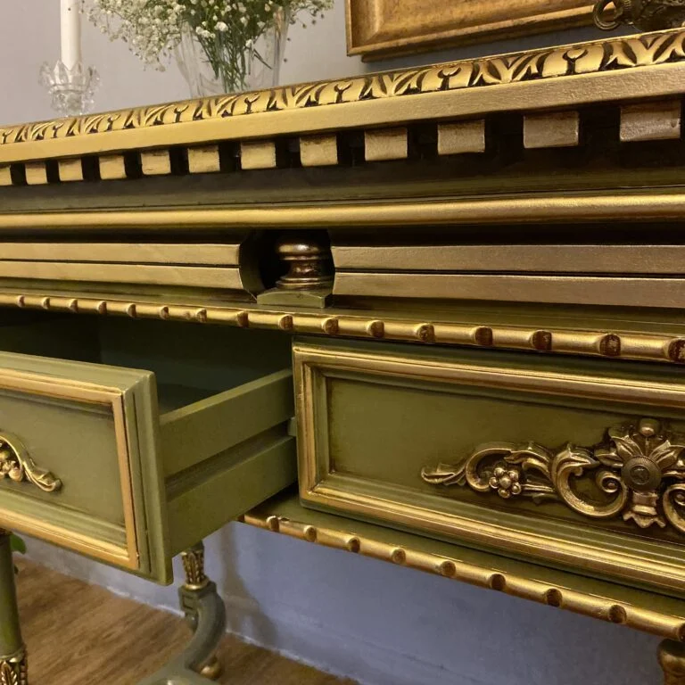 کنسول ویولا سبز و طلایی ساخته شد از چوب راش و با هنر منبت کنده کاری شده است. این کنسول دارای سه کشو قابل استفاده میباشد. این کار به رنگ سبز