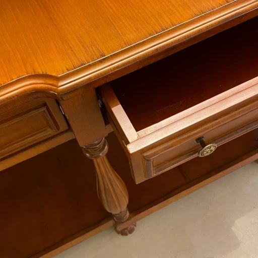 بدنه میز کنسول مدرن قهوه ای از چوب راش ساخته شده است. در پایههای کنسول با خطوط زیبا کار شده است که موجب افزایش زیبایی مجصول شده است. این کنسول سه کشو قابل استفاده دارد.
