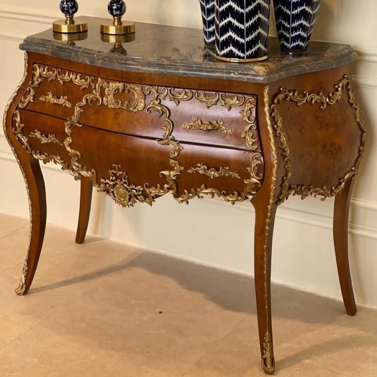 بدنه میز کنسول چوبی دو کشو برنزکوب از چوب راش ساخته شده است و با هنر زیبا و با ارزش برنز زینت داده شده است. بر روی صفحه این کار سنگ